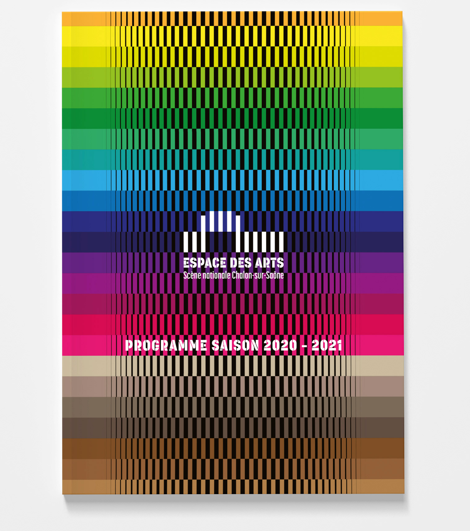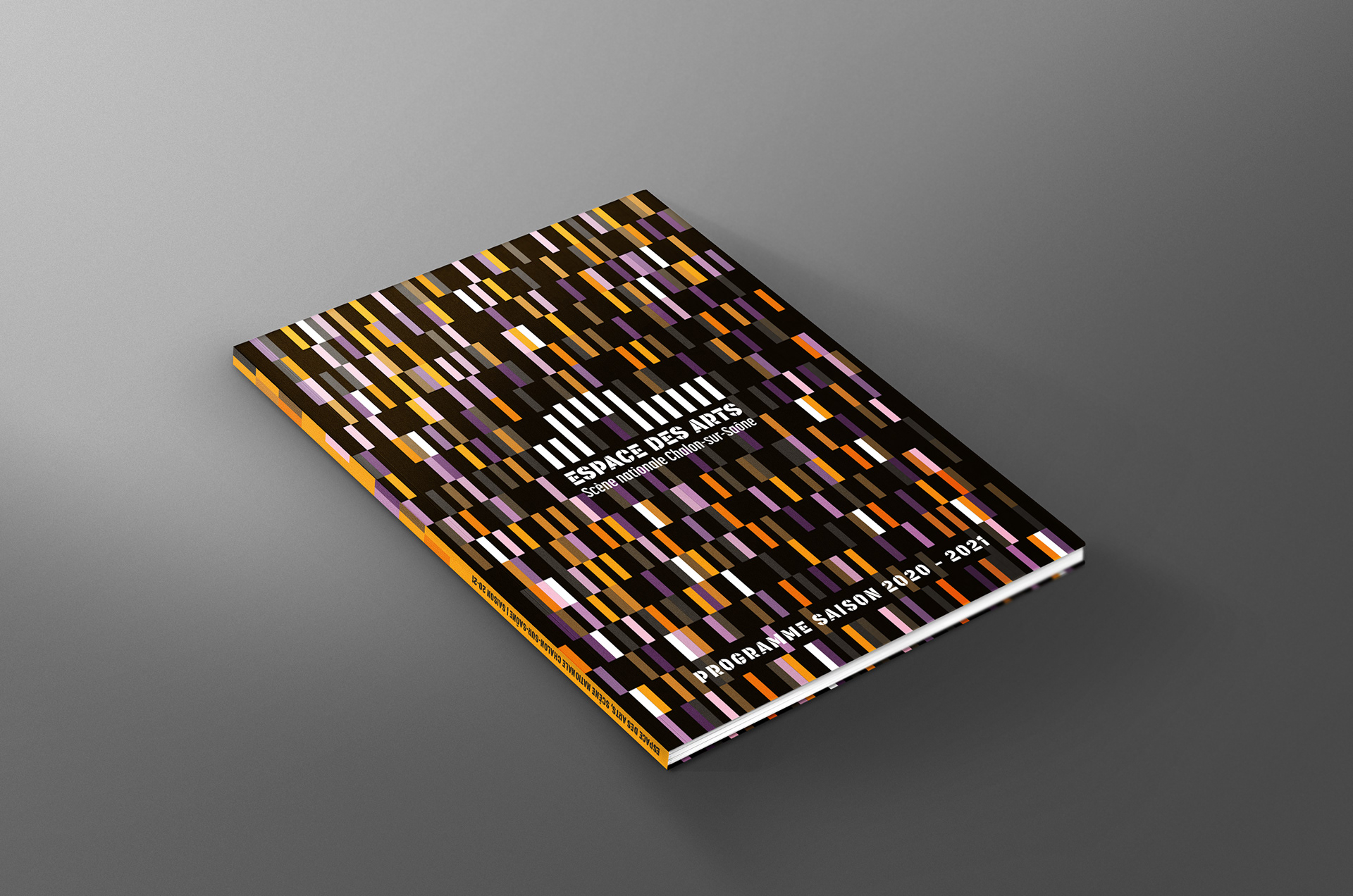 Le format allait être revu pour plus grand (200x280 mm) et l’idée était de jouer avec la structure du logotype dont les barres reprenant la forme du bâtiment font penser à des Kaplas. Après une grosse présentation cette direction fut sélectionnée par l’équipe de l’Espace des Arts.